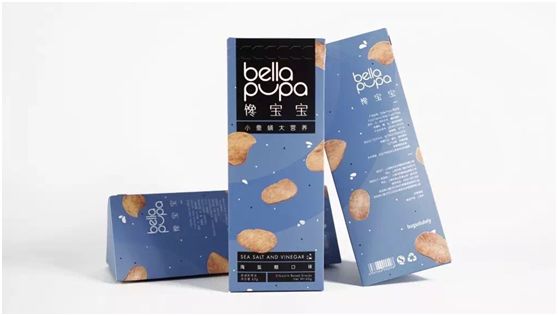 Bella Pupa Chanbaobao is a chips-shaped snack made of 26% silkworm chrysalis powder. It is the first edible insect product in China, created by the joint efforts of serial entrepreneur Massimo Reverberi and a team of Chinese and French food designers and scientists. Bugsolutely uses silkworm chrysalis meal with the highest quality, which is an innovation. First of all, silkworm pupa is rich in proteins, vitamins, minerals, folic acid, and cellulose, and is popular with some consumers in China. Second, it requires less resources and space to raise silkworm pupas while it has higher protein conversion rate. Given the circumstances of rapid population growth and a risk of food shortage, this kind of food will be of great significance. Third, in terms of flavor optimization, the research team developed 48 product prototypes to run sensory tests to better serve Chinese consumer's demands for delicacy.