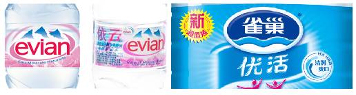 But how large should the diamond be? What cut is best suited? Some brands choose to show local verbal identity in an understated fashion. Evian 依云, one of the world’s premium water brands, chooses to focus on its Latin name to remind consumers of the natural source at Evian-les-Bains in France. The Chinese name 依云 (to sit on a cloud) is shown only lightly on the side. Conversely Nestle Pure Life shows the full Chinese name 雀巢优活 (Nestle Outstanding Life) exclusively to speak natively with its expansive target of families in China. The signature lockup leaves no trace of a foreign brand.